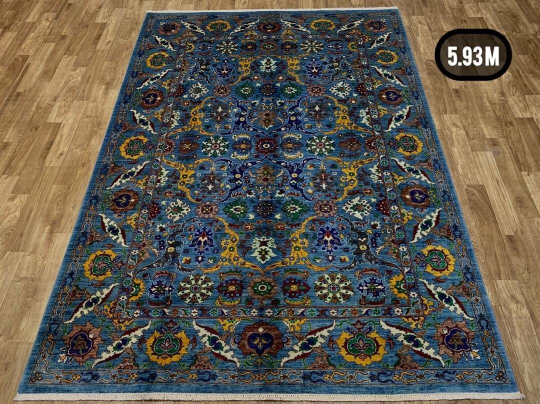 The rug is framed by a detailed border that complements the lively field while maintaining visual balance. Inspired by traditional Persian garden motifs and Afghan weaving heritage, the design creates a sense of movement and harmony across the entire surface.