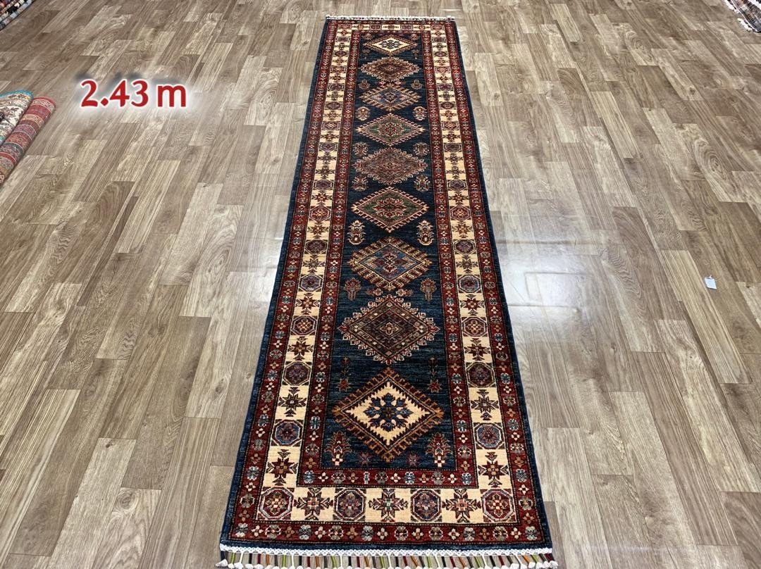 Hand-knotted from natural wool, this runner offers durability, texture, and rich color depth. Its elongated shape makes it ideal for hallways, entryways, or narrow spaces where a striking traditional pattern can add warmth and character.