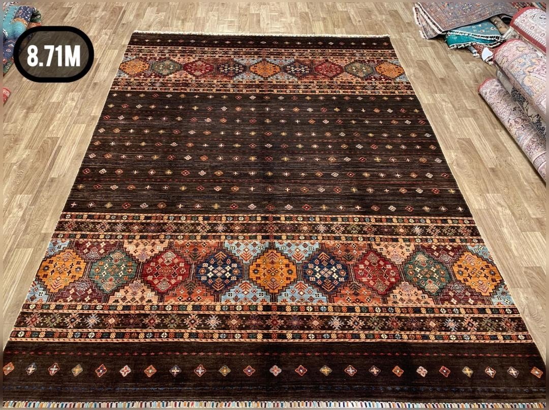 Bands of vibrant medallions in rust, gold, ivory, turquoise, and deep blue provide contrast against the dark field, highlighting the traditional tribal weaving heritage of the design. Detailed decorative borders frame the rug, reinforcing its strong geometric character. Hand-knotted from natural wool, this rug reflects Afghan village weaving traditions and offers durability, warmth, and rich color depth. Its bold contrast and structured pattern make it a distinctive centerpiece for living rooms or large seating areas.
