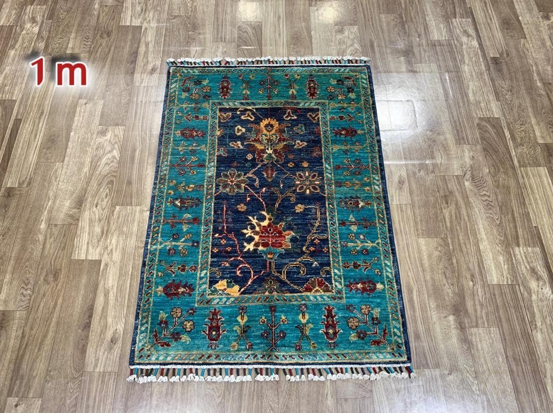 A turquoise border frames the design with intricate floral details, adding contrast and enhancing the rug’s vibrant color palette. Accents of ivory, gold, and crimson highlight the delicate craftsmanship woven throughout the piece. Hand-knotted from natural wool, this rug reflects the artistry of Afghan weaving traditions and offers durability, texture, and warmth. Its compact size makes it ideal for entryways, bedside placement, or small seating areas where a touch of color and traditional character is desired.