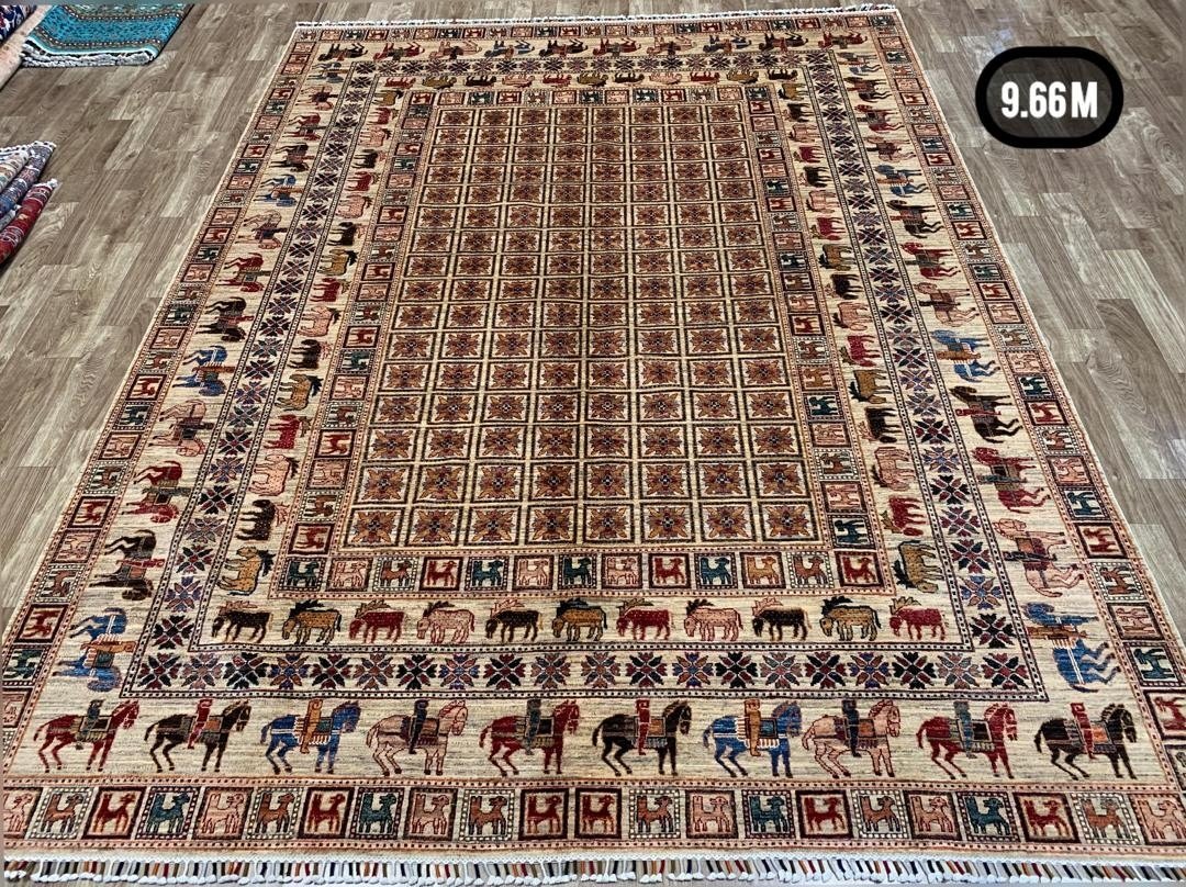 A distinctive hand-knotted rug featuring rows of stylized animal and tribal motifs arranged in structured geometric panels. Camels, horses, and symbolic figures appear throughout the design, reflecting traditional nomadic storytelling woven into the textile.
