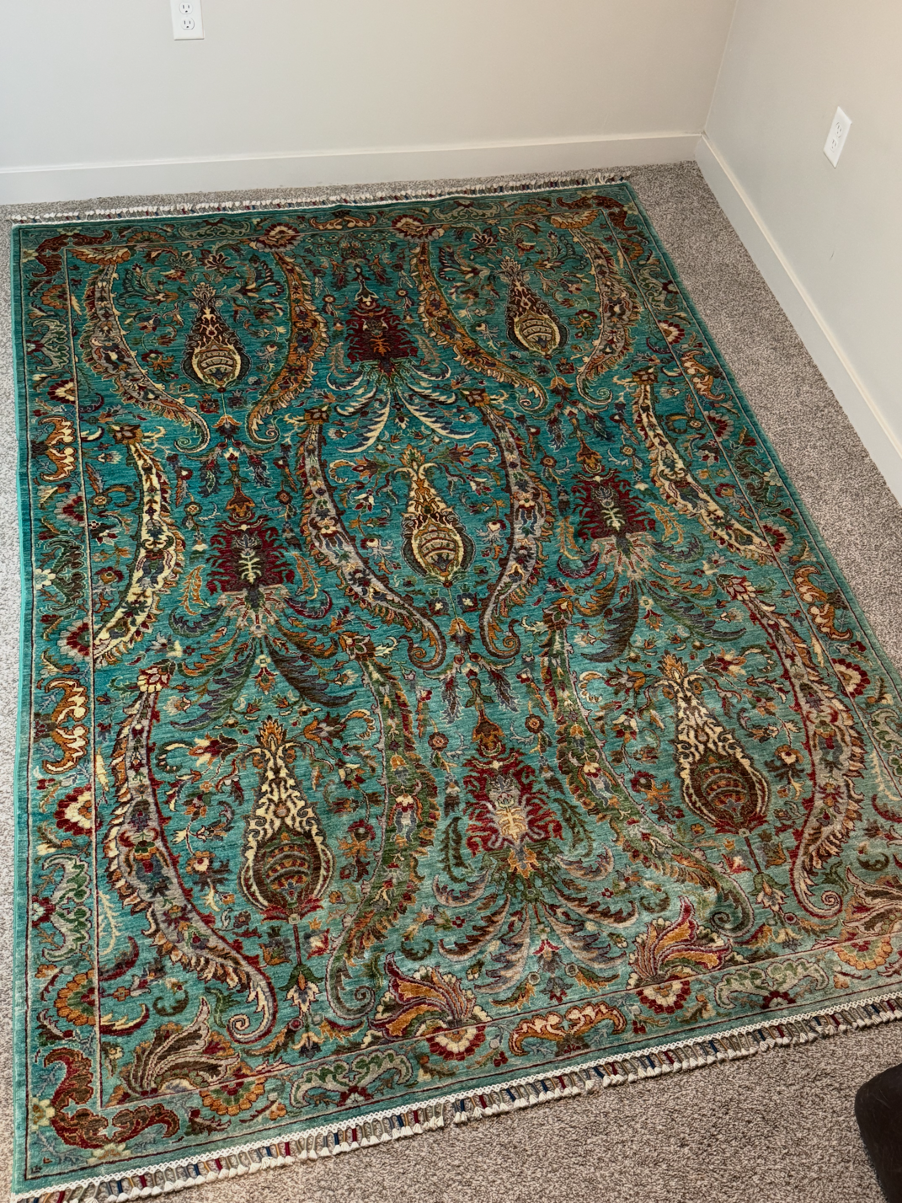 A striking hand-knotted rug featuring an elegant turquoise field filled with flowing paisley (boteh) motifs and intricate botanical patterns. The sweeping designs create movement across the surface, giving the rug a graceful and sophisticated presence.